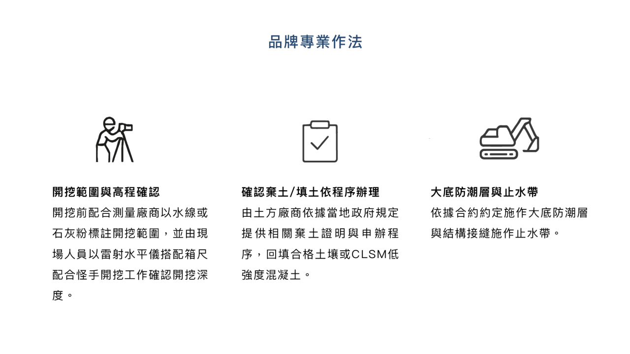 推薦品牌工法 : CLSM低強度混凝土回填材,大底防潮層與止水帶。