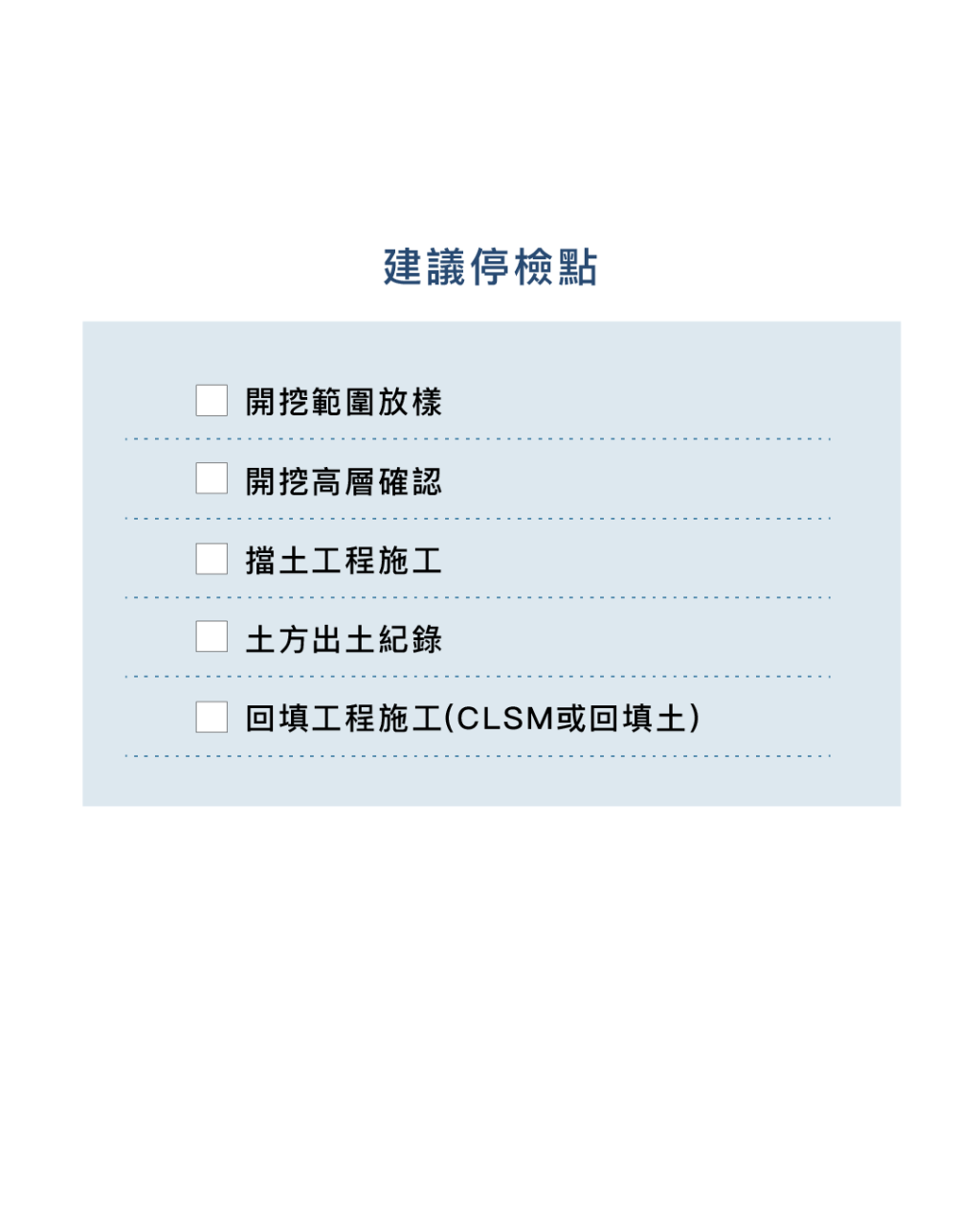建議停檢點 : ✓ 開挖範圍放樣 ✓ 開挖高層確認 ✓ 擋土工程施工✓土方出土紀錄 ✓ 回填工程施工(CLSM或回填土)