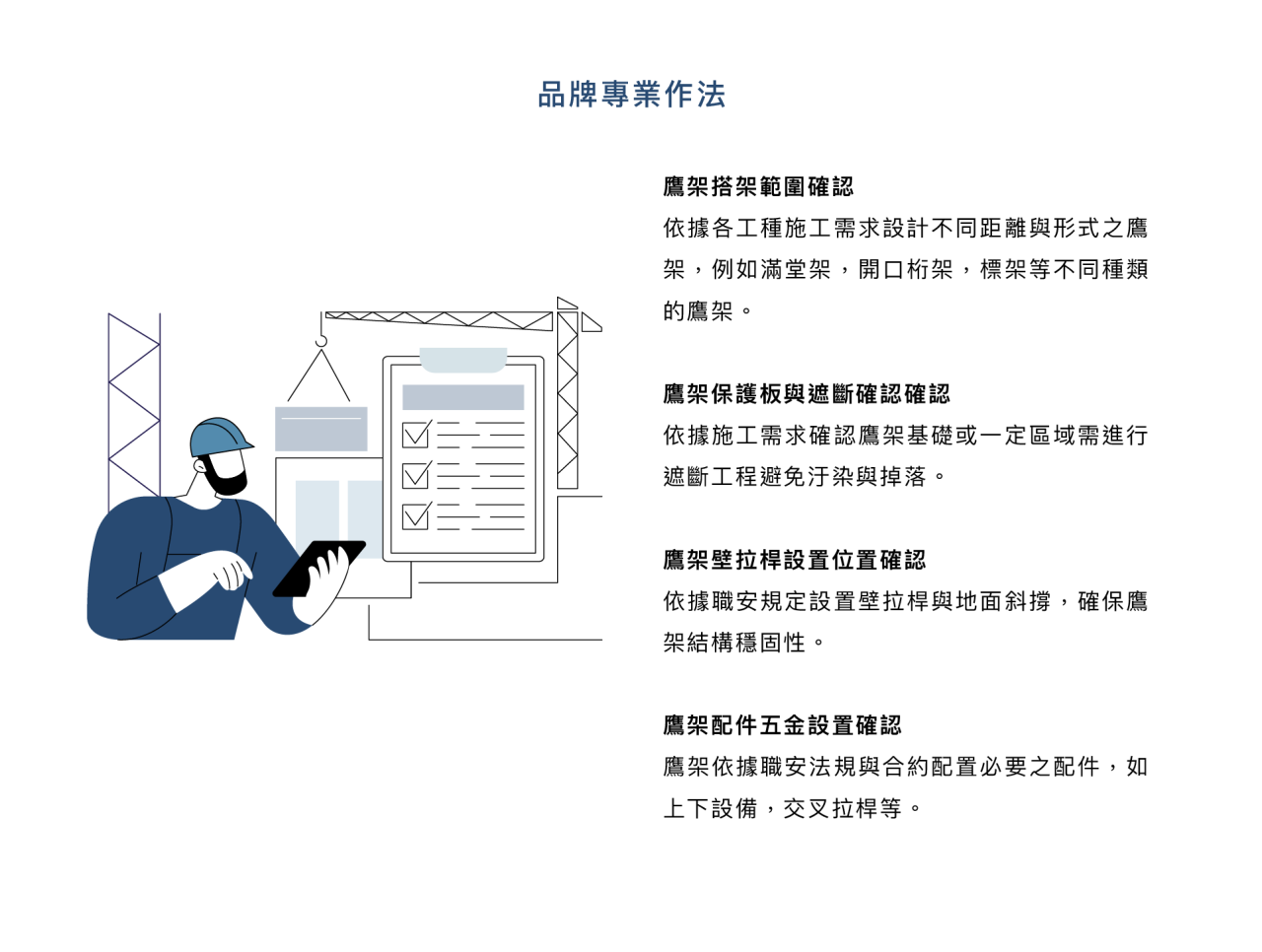 優點 : 確保鷹架穩固性與職安,同時避免勞檢所檢查開設改善通知與罰則。
