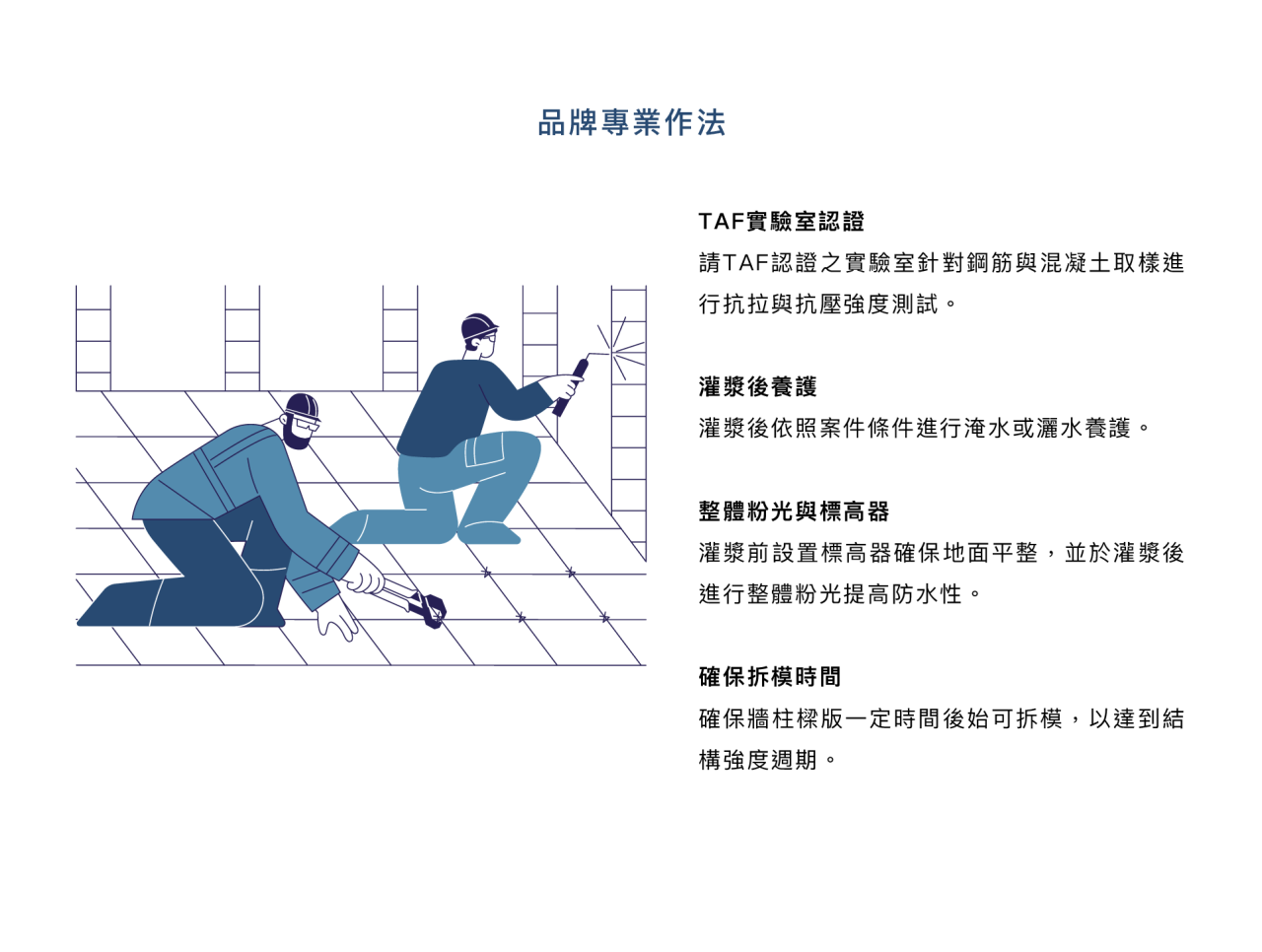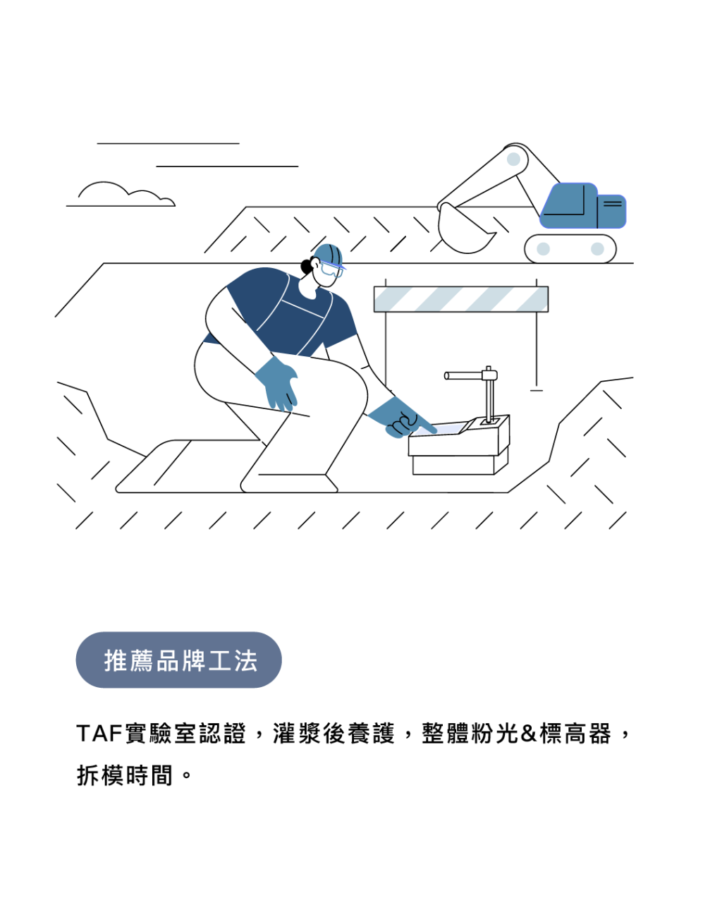 推薦品牌工法 : TAF實驗室認證,灌漿後養護,整體粉光&標高器,拆模時間。