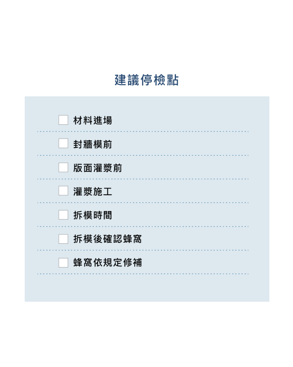 建議停檢點 : ✓材料進場✓封牆模前✓版面灌漿前✓灌漿施工✓拆模時間✓拆模後確認蜂窩✓蜂窩依規定修補。