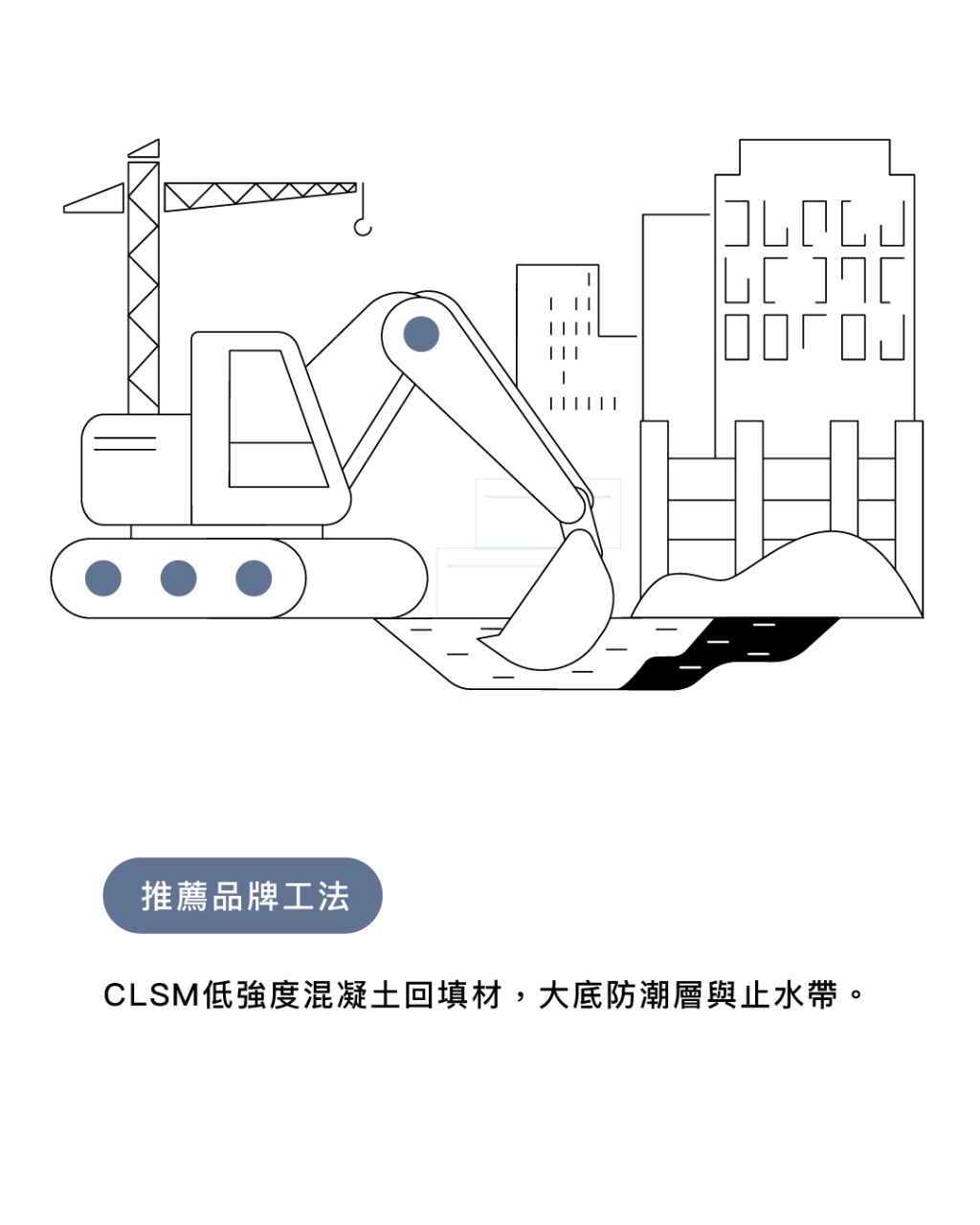 推薦品牌工法 : CLSM低強度混凝土回填材,大底防潮層與止水帶。